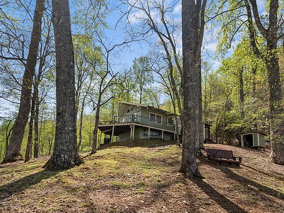 This eye-catching mountain cottage is the peaceful retreat you've been searching for! The home sits on its own mountain overlook, giving you complete privacy and stunning long range mountain views that change with the seasons. The prow style deck is truly special. A perfect spot to start your day with coffee as the sun rises, or unwind while watching the sunset over the mountains. The porch extends along either side of the home, and has plenty of room for entertaining. Inside features vaulted white beamed ceilings that create an airy, open feeling. French doors connect directly to the porch, bringing the outdoors in and flooding the warm hardwood floors with natural light. The cozy red wood stove adds character and warmth during cooler months. Though modest in size, this home makes the most of its footprint with a smart layout and connection to its natural surroundings. The property feels like a true mountain getaway while still being accessible and close to town (though the dirt road leading up adds to its secluded charm). If you're looking for a place where you can truly relax, enjoy nature, and experience the beauty of Western North Carolina, this home delivers in every way.
