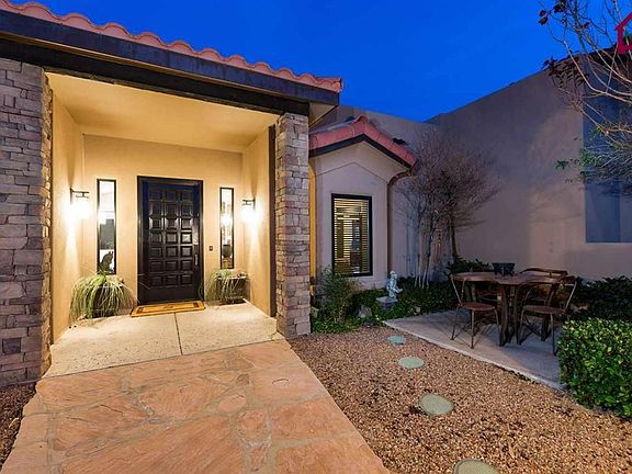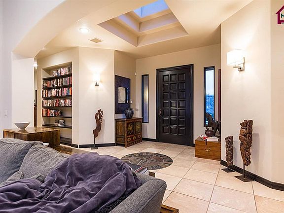 Enjoy true elegance & luxury in this custom-built contemporary Southwestern home with four bedrooms plus office, beautiful designer pool & spa, & commanding views of the Organ Mountains, valley & City. Lovely courtyard with gardens & seating area leads to elegant entry. Great room has soaring ceilings, wood beams, dramatic stone fireplace & expansive windows capturing amazing views. Chef's kitchen has beautiful granite counters, custom cabinets, KitchenAid cooktop & refrigerator, center island,built-in double ovens & microwave, large pantry & breakfast bar. Large master bedroom has maple hardwood floor, two large walk-in closets, sweeping bank of windows with view of pool & mountains. Luxurious master bath with jetted tub, large walk-in shower, gorgeous granite, double sinks, & vanity. Possible second master with en-suite bath & walk-in closet, 2 add'l guest bedrooms, 2 guest baths (one opens to patio & pool area). Home is powered by 41 solar panels saving over $3700 per year in elec