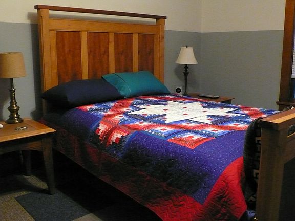 - Large master bedroom with queen-size, custom hardwood bed set, and huge walk-in closet