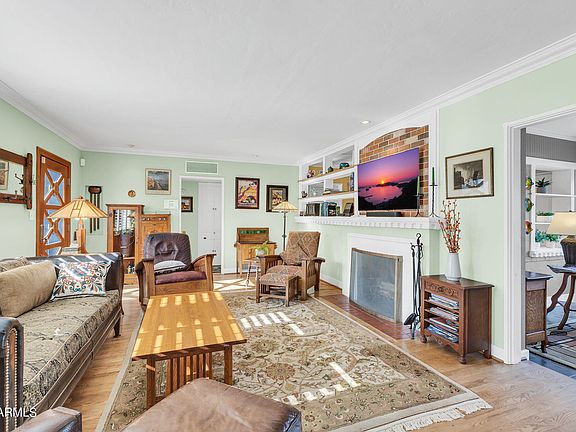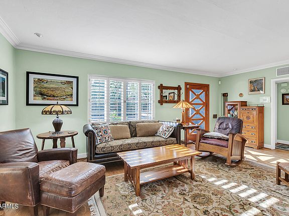 Charming 1930s block ranch home nestled on Coronado Rd in Historic Palmcroft. The living room exudes elegance with crown molding, an arched doorway, and a cozy wood-burning fireplace. The dining room boasts crown molding, wainscoting, plantation shutters, and a bay window flooding the space with light. The kitchen is a chef's delight with granite counters, stainless steel appliances, and remodeled cabinets. The primary bedroom features wood floors, plantation shutters, a ¾ bath, walk-in closet, and French doors opening to the backyard. The second bedroom offers 2 walk-closets, wood floors, and plantation shutters, while the 3rd has been transformed into a functional office. A small family room complements the living space. tep outside to enjoy grassy yards, a patio, a sparkling Pebble Tec pool, refreshed in 2019 with a variable speed pump. The exterior also showcases lush palms, creating a serene oasis. The A/C was upgraded just 2 years ago, ensuring comfort year-round. Additionally, a detached 2-car garage with a 220v outlet caters to electric vehicle needs. This meticulously maintained home seamlessly blends historic charm with modern amenities, offering a timeless and comfortable living experience.