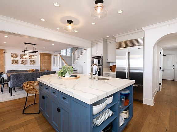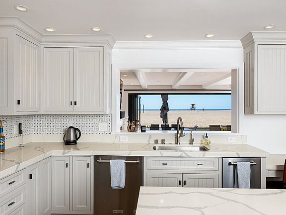 Ocean front propertyCustom marble islandModern california coastal interiorFull sized billiards roomStainless steel appliancesMultiple seating areasLarge brick patio