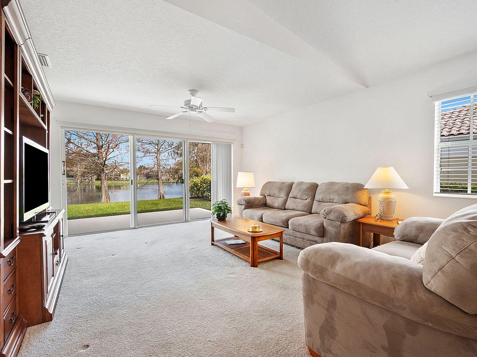 Welcome to this furnished villa, ideally located at the quiet end of a desirable all-ages, gated community. This one owner home has an extended floorpan with spacious living areas and is positioned to take in the panoramic lake views! The villa comes equipped with modern appliances, replaced in 2020, including a Samsung washer and dryer. The AC and water heater were also replaced in 2020, offering energy efficiency. Accordion storm shutters provide convenient and durable protection during storm season. Located in a vibrant, amenity-rich community that includes: pickleball, tennis, 2 heated pools, gym, bocce, basketball, playground, and a clubhouse with many social activities. The HOA fees cover internet, cable, landscaping, security, and exterior painting, so you can enjoy a low maintenan ce lifestyle!
