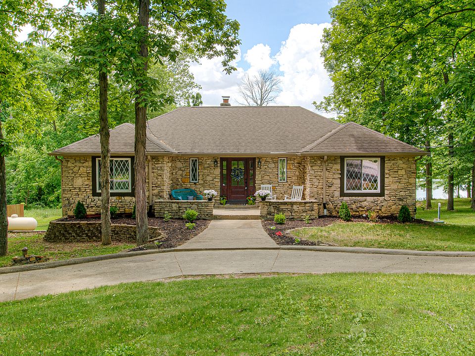 Stunning lakefront property on 1.5 acres boasts a freshly remodeled 4 bed, 3 bath stone ranch with new flooring, paint, kitchen, bathrooms and deck on fully updated walk-out basement. The basement with a waterfront view w/stone fireplace gr room, exercise room, 4th bedroom and full bath. You will love that all your living space is on the main level with a beautiful bay window and updated deck to enjoy your morning coffee overlooking the water. The laundry room is on the main floor, too. You will love the peace and tranquility on this beautiful waterfront lot. Furnace converted to propane with all new electrical and plumbing service and septic pumped. If you want less acreage, lot (.7) acres can be sold separately. Come check it out!