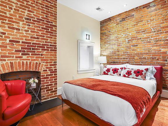 Sleek modern designVictorian-era row homeExposed brick wallsOriginal hardwood floorsKing-size bedroomEn suite bathroomCozy queen bed