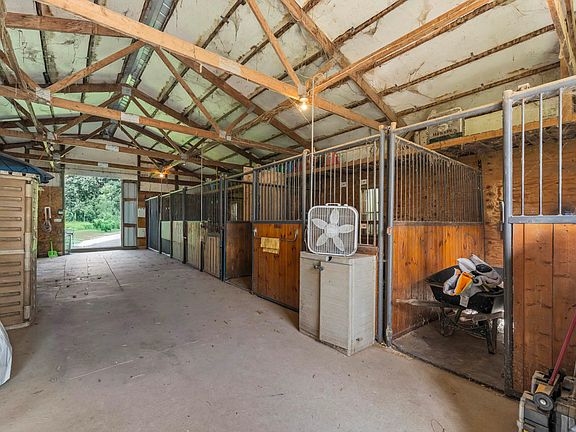 Privacy & space galore on this 12-acre hobby farm, tucked away in a beautiful wooded setting w/ cleared pasture areas- perfect for horses, animals, or future expansion. The well-built all-brick ranch home features 4 spacious bedrooms, 1 full bath & 2 half baths, including a primary suite w/half bath, walk-in closet & double wall closet. Enjoy a HUGE eat-in kitchen w/walk-in pantry & oversized living room. Mostly unfinished basement features exterior access & includes an office, half bath & roughed-in shower room ready for finishing. SO much potential!!! Detached 3-car garage, plus a 5-7 stall horse barn with water, electric & 2 sliding barn doors. A semi trailer stays for extra storage. This rare offering combines privacy, acreage & opportunity- ready for your vision of country living!