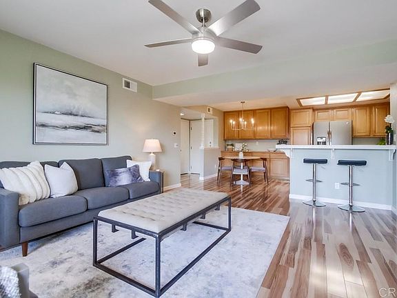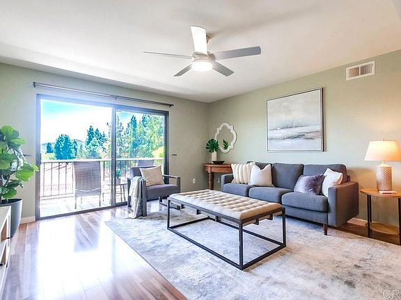 Beautiful single-story, entry-level condo without stairs in Bernardo Greens community located in the desirable area of Rancho Bernardo. Private balcony with panoramic mountain views. Perfect for enjoying the sunset with a glass of wine or relaxing with your morning coffee. Light and bright bedrooms with oversized closets, freshly painted walls, and new laminate flooring throughout. New refrigerator, electric range oven and microwave. Brand new ceiling fans in both bedrooms and living room. New chandelier in the dining area for game night with friends. Full size washer and dryer inside the unit. One car detached garage around the corner and plenty of open parking spaces. Gated building access and resort-like community pool and spa. HOA dues include membership to Bernardo Heights community center with tennis courts, 2 Olympic size lap pools, spas, pool tables, BBQ areas, and even a pickle ball courts. Minutes to shopping, restaurants, schools, parks, wineries, golf courses, and fwys. Award winning top school district.