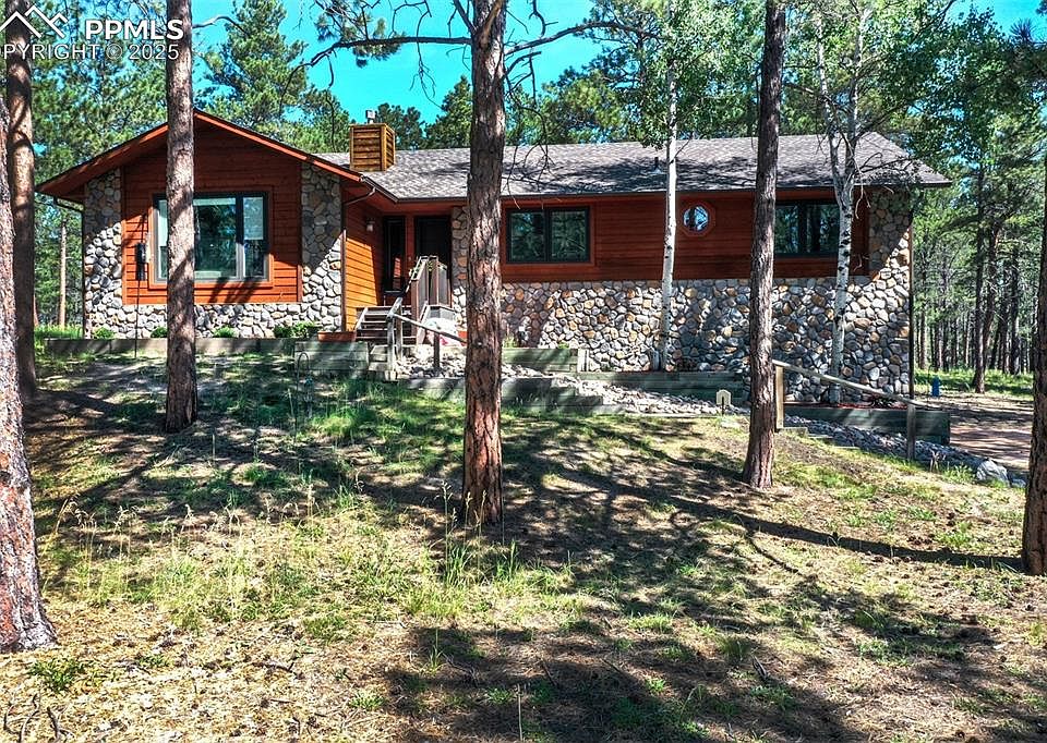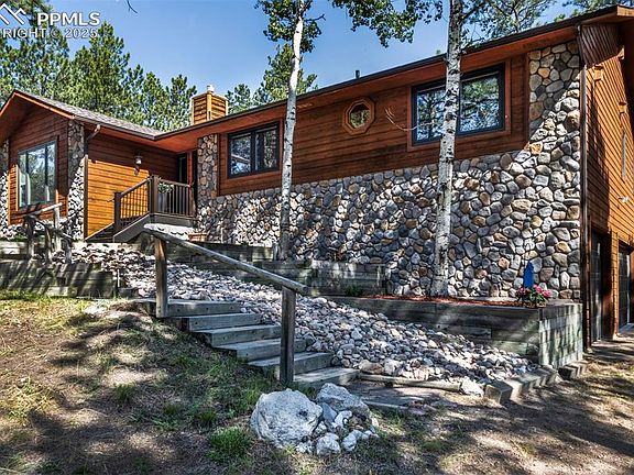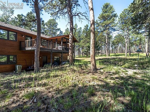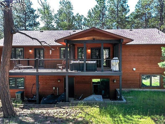 Beautifully cared for, this wonderful home is located in the pines at the end of a cul-de-sac. It is the perfect spot to sit on your covered deck and enjoy the quiet oasis that surrounds you. Access to the deck is from the kitchen/sitting area or off your master bedroom. This 5 acre parcel is serviced by a domestic well if the new owner is interested in having horses. The main level has a double sided river rock gas fireplace between the living room and the kitchen/dining areas. The kitchen has a large counter bar and space around it for an additional sitting area or eating space. The large master bedroom has an attached five piece bath, a walk-in closet and deck access. There are two additional bedrooms and a full bath on this level. The main level has hardwood floors in all but the master bath. The unfinished basement is a blank slate with high ceilings, a rough-in bath and a sliding door to a small concrete patio. The three car garage has two openers, an EV charging station and a door to the backyard. The roof is a class 4 hail resistant shingle. The composite deck has been redone with a reinforced steel design and is partially covered.