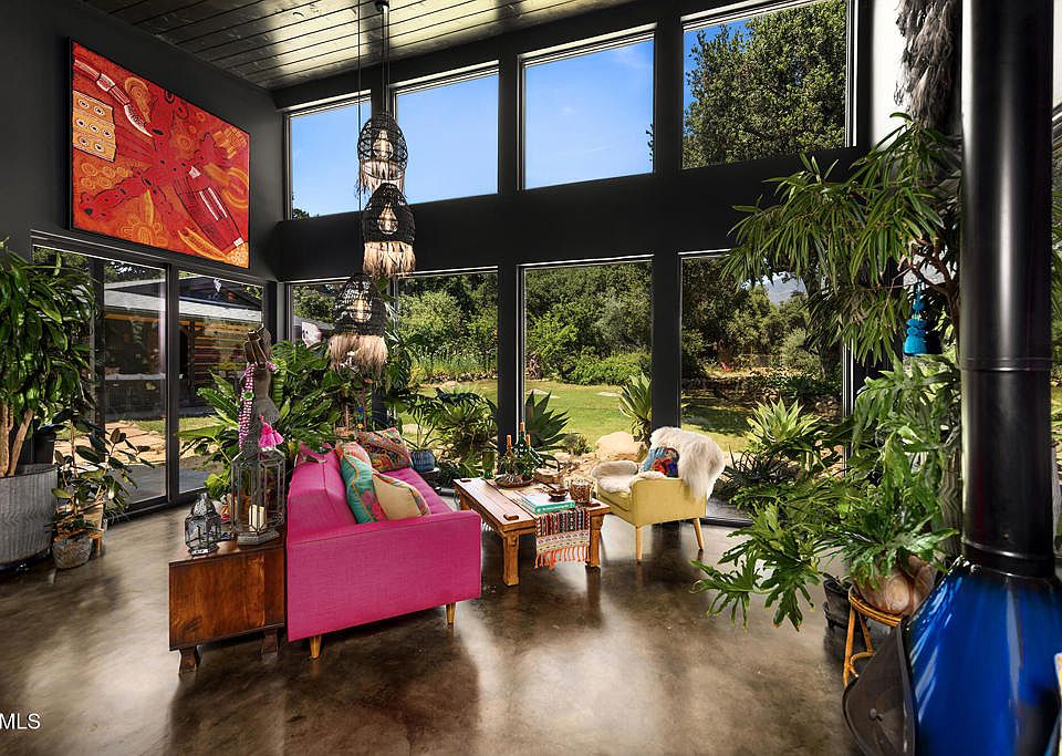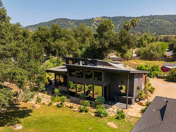 This newly built contemporary compound with views of the Topa Topas blends the natural beauty of Upper Ojai Valley with modern design by local architect Jane Carrol. Drawing on cheerful Mexican and Indian aesthetics, the home is impeccably appointed, offering an ideal environment for retreats, families, artists, or ranchers.The property includes a 3BR/2.5BA main house, large yoga/teaching studio, 3-car garage with gym, a tiny house, and a garden 'writing' shed--all fully permitted. The lush, fully landscaped grounds feature mature trees, expansive gardens, a sauna, outdoor tub, horse pasture with three shelters, custom duck and chicken coops, a pond, and a protected dog run. It's a private, self-contained world.Inside the main house, a north-facing wall of glass and 16' ceilings flood the space with light and stunning mountain views. Polished concrete floors, bold paint choices, and vibrant details enhance the unique aesthetic. Highlights include antique Mexican and Indian doors, a Malm fireplace, Smeg Italian oven, walnut counters, custom cabinetry, gorgeous tilework, and vanities with copper and Talavera sinks. Modern amenities include mini-split HVAC, solar power with Tesla battery backup, a wine cooler, extra fridge/freezer, and a full laundry room. The covered patio features an outdoor kitchen with a sink.The spacious studio offers wood floors, natural light, heating/AC, and a new sound system--ideal for teaching or creative work. The tiny house features a loft bed, walk-in closet, hot water shower, sink, composting toilet, and kitchenette. The garden shed offers a peaceful workspace for writing or reflection.Shaded by oak and walnut trees, the grounds also include a 17-variety fruit orchard, succulents, flower and vegetable beds, a turtle pond, and ample room for animals. Storage sheds, 2 wells, a Sisar water share, a dedicated reservoir, and perimeter sprinkler systems supported by pressure pumps ensure self-sufficiency. All power lines have been buried for unobstructed views.This remarkable property offers a rare blend of beauty, privacy, and function--perfect as a retreat, artist's haven, or garden-rich homestead. It must be experienced to fully appreciate its thoughtful design and magical setting.