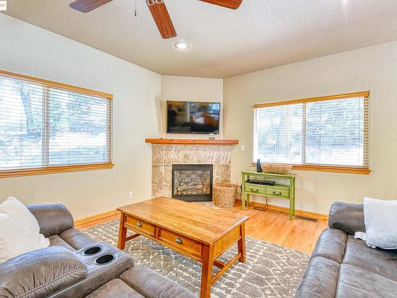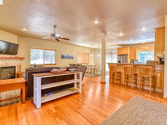 Propane fireplaceConifer treesGourmet kitchenBreakfast barTiled surroundOak flooringBirch cabinets