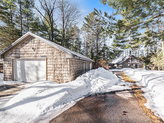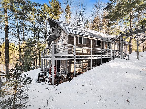 Nestled among towering white pines, this cottage or year-round home sits on 2 acres with 100 ft. of frontage on peaceful Indian Lake. Indian Lake is a 70 acre no-wake lake popular for pan fishing, pontoon boating and kayaking. The home's convenient mudroom/entry opens to a combined kitchen, dining area, and living room with a wood burning fireplace. Enjoy sweeping lake views from each room and the wrap-around deck. The spacious primary suite offers a private deck to savor nature and your morning coffee. The attached full bath also has hall access and a 2nd bedroom and a combined laundry and half bath complete the main floor. Two additional large bedrooms, with balconies, and a full bath can be found upstairs. The lower level with walk-out has new LVP flooring and provides additional and sleeping space, a bonus kitchenette and plenty of storage in the mechanical room. The rear yard is perfect for bonfires and yard games and don't miss the 3-stall garage with space for all of your toys. Conveniently located to an abundance of ATV and snowmobile trails. Recent updates include conversion to natural gas, extension of heating to the finished basement area plus a gas fireplace rough-in and new composite stairs to the lake and dock.