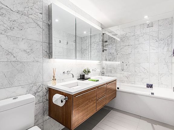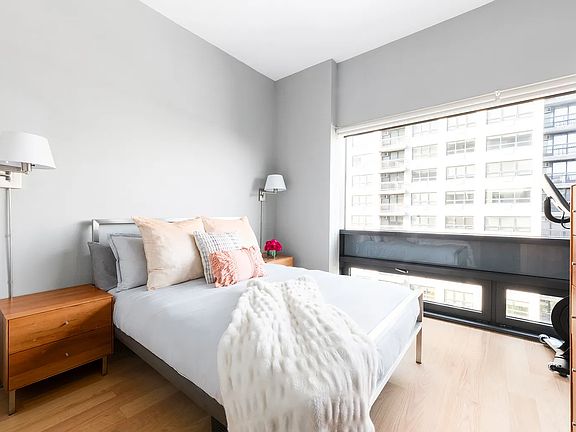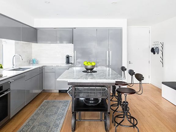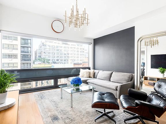 A renovated one bedroom/one bathroom condo ideally located only one block from Union Square. As you enter, you are welcomed into the 26' living/dining/room kitchen that is flooded by light from the triple-layered picture window. The renovated Poliform kitchen features a Miele refrigerator, range and dishwasher and a stacked Bosch washer/dryer is concealed cleverly behind the cabinetry. A custom marble and metal island doubles as a stylish dining table which could easily accommodate six. Wide-plank solid white oak floors are featured throughout as well as soaring 10.2' ceilings, automated solar shades, and a dual-entry marble bathroom with a double vanity and soaking tub. The bedroom features two generous, built-out walk-in closets. Central air conditioning and heating are controlled by a Nest system. This full-service boutique condo building has an extensive list of amenities, including a 24-hour attended lobby, business center, a common outdoor garden terrace with a Viking grill and outdoor movie projector, state-of-the-art fitness center, and additional storage spaces, including a bike room. Having such close proximity to Union Square provides the ultimate lifestyle with public transportation, Trader Joes, Whole Foods, the Union Square Green Market, shopping on Fifth Avenue and great dining within blocks.