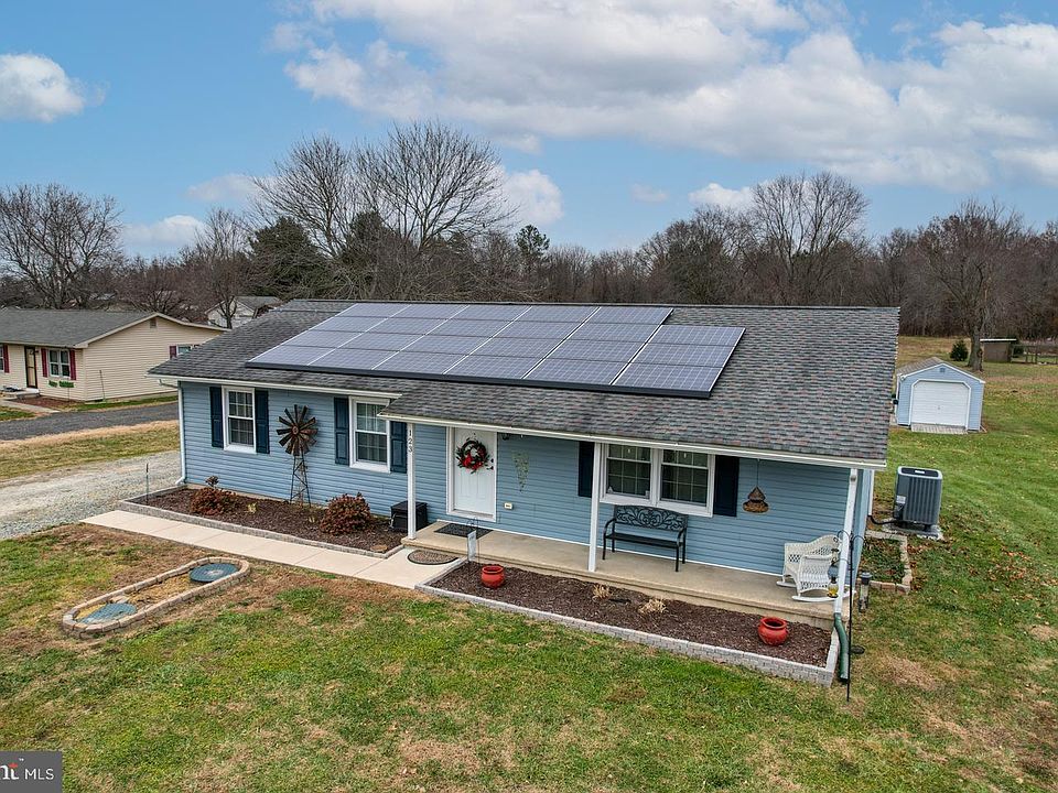 Updated ranch home on 1.25 acres in the Appoquinimink School district. IN 2016 a new septic system was installed, new windows were installed, easy care bamboo flooring in the high traffic areas, updated kitchen with stainless steel appliances, and granite counters and a door to allow access to the rear yard. Humidity controlled fans in the crawl space, rainsoft water purification system with reverse osmosis water tap. Rainsoft UV light installed on the HVAC for air purification, 12 X 16 garden shed w/garage door, Samsung stackable washer and dryer,Solar panels installed , cable/TV outlets in each room. The are ceiling fans with lights in each room. IN 2019 the following were installed partially floored attic for storage, clear and remove stumps from the huge rear yard, Concrete front walk way. 2020 Hall bathroom was fully renovated and invisible fence put in 2021 the driveway was widened to 20 feet, New HVAC system 20 SEER 2 stage heat pump and variable speed blower air handler along with a smart thermostat