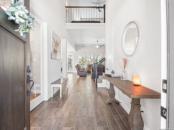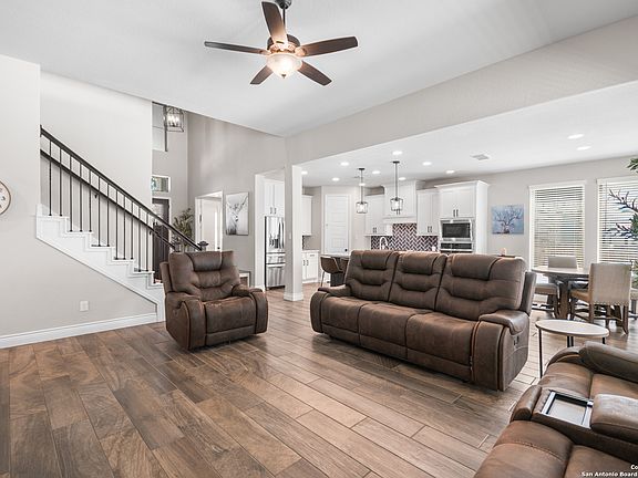 Located in the gated Ranches at Creekside, this 2,766-square-foot home offers 4 bedrooms, 2.5 bathrooms, and a dedicated office, and sits on a quiet cul-de-sac. The living area, kitchen, and breakfast area allow for a great view of the pool and also an abundance of natural light! The primary suite and 1/2 bath are downstairs, while the upstairs features a gameroom, three bedrooms, and a bath. Enjoy your low-maintenance private pool, with both a heater and a chiller, and a generous entertaining space, all while being just a few of minutes' walk to the brand-new amenities center, playground, and community pool. The backyard is also low-maintenance if you're looking for minimal yard work. This home also features a whole-house filtration system, water softener, and reverse osmosis system. The seller added an exterior laundry-room door during construction that opens to a fenced dog area. The Ranches at Creekside does not have a MUD tax and is located within the highly esteemed Boerne ISD. Just minutes from downtown Main Street and La Cantera, this home is in the perfect location! **There is a $500 working capital fee that is a buyer expense due at closing.