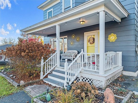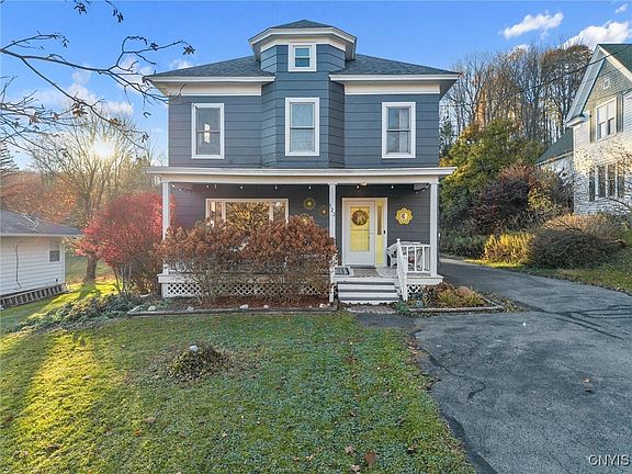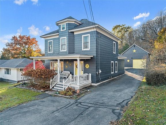Located just 15 minutes from Colgate University, this Oriskany Falls home will stop you in your tracks with its incredible curb appeal.  Inside you will find beautiful original woodwork, tall ceilings and character filled details throughout.  The spacious living room with beautiful large windows and cozy den are separated by a gorgeous pocket door, perfect for creating both open flow or intimate spaces.  Relax on either the open front porch or covered rear patio overlooking the partially fenced yard.  A two-story carriage barn offers excellent storage, workshop space, or the potential for creative repurposing. Major updates including a new roof, new boiler and new hot water heater.