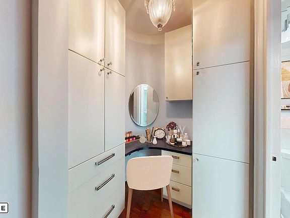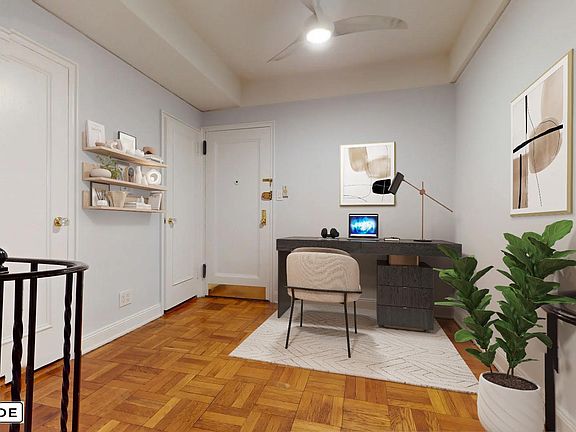 Apartment 4B has been beautifully renovated while preserving its classic pre-war character, featuring 9-foot ceilings, elegant wood moldings, and classic parquet floors. The windowed kitchen boasts custom cabinetry, stone countertops, a breakfast bar, and modern stainless-steel appliances. The custom vanity office area comes with a plethora of generous counter space and storage, while the updated bathroom is adorned with a sleek glass shower enclosure.