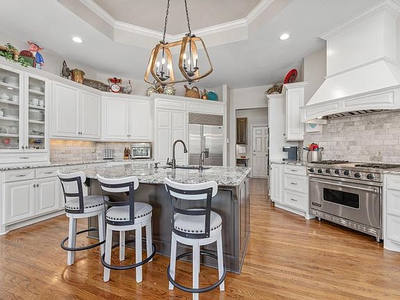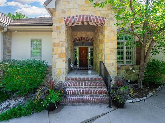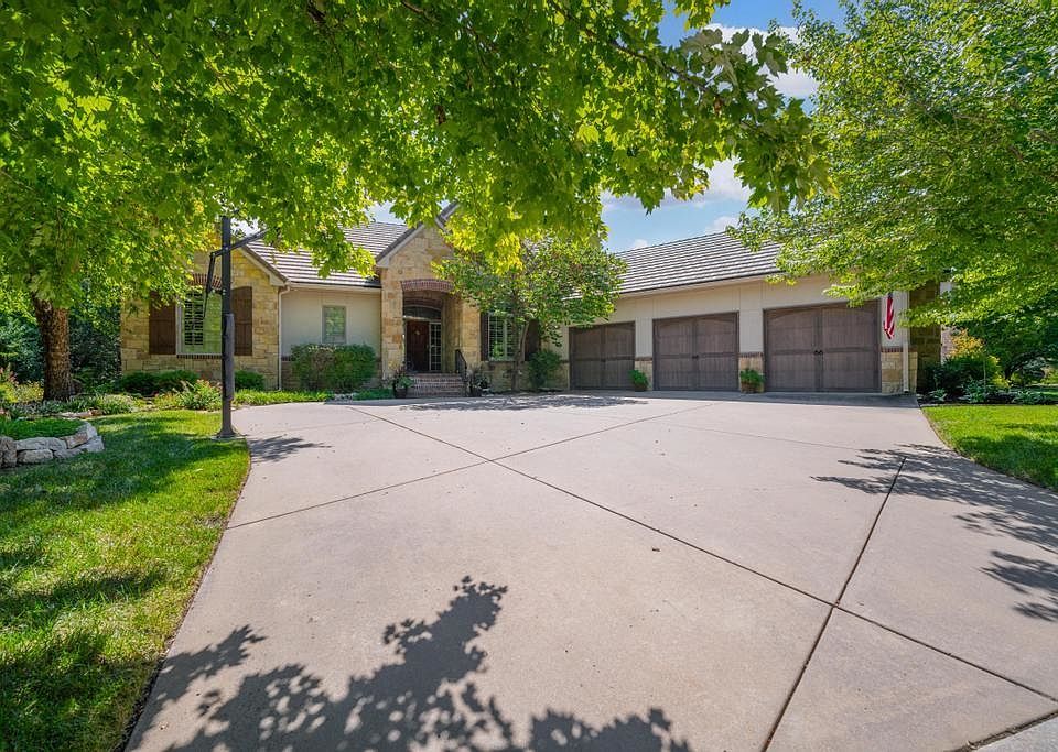 Welcome to your private resort retreat in the gated Flint Hills National community! This stunning lake lot features a recently installed heated swimming pool w/auto cover, lush landscaping, a stone fireplace for gatherings with outdoor living spaces. The home is built with premium materials—real stucco, stone, Andersen windows, and a concrete tile roof. Inside, you'll find a chef’s kitchen with Viking range, Sub-Zero fridge/freezer, granite countertops, walk-in pantry, and casual + formal dining areas. The main floor includes a spacious primary suite with French doors, dual walk-in closets, and deck access, plus a 2nd bedroom with en-suite bath. A formal dining room and breakfast nook in kitchen. There is a cozy formal living room with a fireplace and a wall of windows. The Hearth Room/Family Room is spacious and light and stone fireplace that is stunning. The walk-out basement features a cozy Colorado cabin feel with a spacious family room/rec room, fireplace w/built in shelves, full bar, home theater system (included), gym, 2 bedrooms, and large storage with 10-ft ceilings—ideal for a golf simulator. Enjoy the covered patio with built-in grill and stone fireplace, all overlooking serene lake views. HOA covers lawn care, sprinkler open/close, and snow removal. Located in the award-winning Andover School District. Membership required for Golf. Call today for private appt. This is a rare find!
