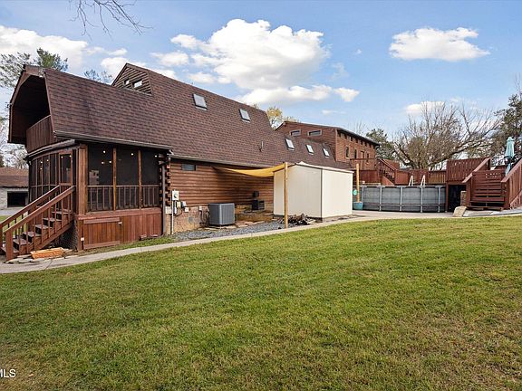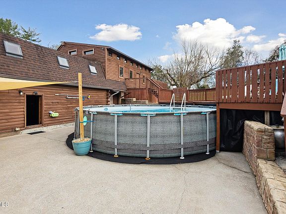 The outdoor living spaces are a highlight, with several porches to enjoy the surrounding nature. In addition to the front wraparound porch, the primary suite boasts its own private deck with a hot tub and swing, perfect for relaxation. There's also a back deck and another porch surrounding the above-ground pool for outdoor enjoyment.