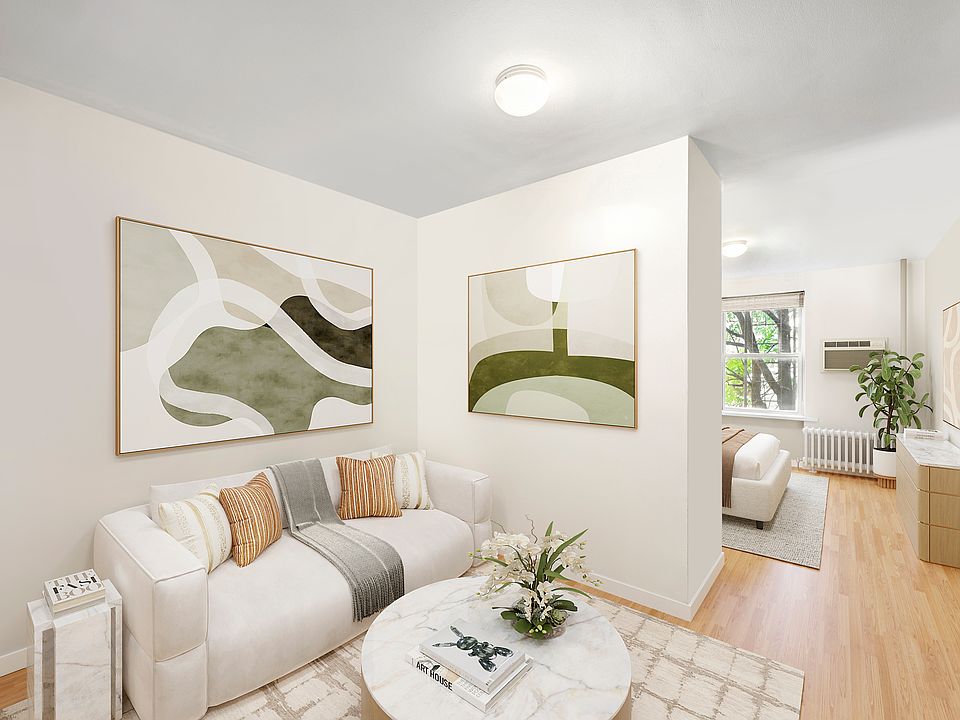 Welcome to 123 Guernsey Street, Apt 2C - an oversized alcove studio apartment on a quiet block in the heart of Greenpoint. Nov. 1st lease start date. *The photography for this apartment has been virtually staged.* Apartment 2C features a thoughtful layout that separates the sleeping area from the main living space, making it easy to create distinct areas for relaxing, dining, and entertaining. The back-facing bedroom is large and features 2 closets. High ceilings and hardwood floors add character, while the kitchen features stainless-steel appliances and good cabinet storage. A windowed bathroom with clean tile and updated fixtures completes the space. Originally built in 1928, this four-story building only contains 8 units, pre-war details, a video intercom and a welcoming atmosphere. Cats are allowed, though dogs are not permitted. Living here means you're close to McCarren Park, the waterfront, and a wide selection of neighborhood cafes, restaurants, and shops in both Greenpoint and Williamsburg. 123 Guernsey is less than a 5-minute walk to the G train at Nassau Avenue, and less than 15 minute walk to the L-train at Bedford Avenue.