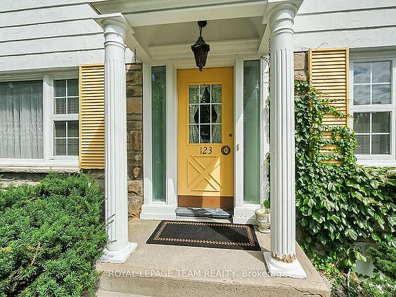 Welcome to 123 Ivy Crescent in the sought after community of New Edinburgh. A charming family home filled with natural light and character. Greeted by mature landscaping and sweeping walkway. The gracious porch entrance leads into the front foyer with guest coat closet and intricate mosaic tile floor. A traditional floor plan with many design options. The generous Living Room with dual aspect windows, features an inviting wood burning fireplace and antique lighting sconces. An entertainment sized Dining Room suitable for warm family gatherings, has double doors to the expansive kitchen, which offers an amazing opportunity to create your own culinary vision. The extended Kitchen features ample cabinetry and a generous eat in area with views over the side patio and rear gardens beyond. Access to the breezeway and single garage from the kitchen .Further extension to the upper level boasts primary bedroom enclave of bedroom with walk-in closet and dressing room or den, to include a recently renovated full en-suite. The second bedroom can easily be converted into two symmetrical bedrooms, each with their own separate closet. Family bathroom is a generous size with over-tub shower. A third bedroom with closet completes the upper level development. Fully finished basement with cozy wood burning fireplace and stone surround, also features a built in bar area. Ample additional storage areas or hobby room. Additional two piece bathroom, spacious laundry room and mechanical area. Enchanting rear yard with mature plantings, tiled patio and walkway all graced with ornate railings and fully fenced. Single car garage with home and exterior access. Make this classic home yours...