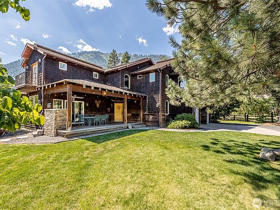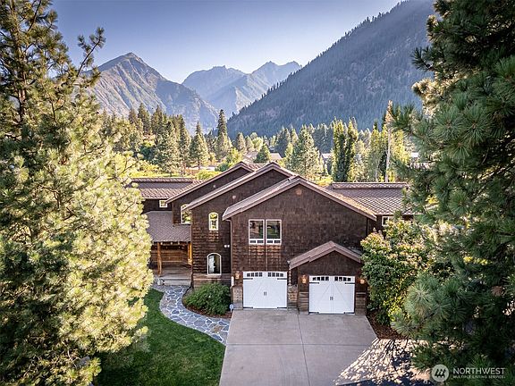 Escape to your own private retreat in the heart of the Icicle Valley. This stunning 4-bedroom home offers breathtaking views from every window. The open-concept design features vaulted ceilings, gourmet kitchen, & stunning wide plank hardwood floors complemented by a rock fireplace. The main level primary suite features a walk-in closet & a lovely spa-like bathroom. The second floor boasts two ensuite bedrooms, a charming bunk room, & a great room ideal for entertaining guests. Outside, enjoy the outdoor dining space with gas fireplace, fully fenced garden, water feature & beautiful landscaping. Located minutes from the Icicle River on two parcels with nearby hiking trails, this unique property is the perfect place to call home!