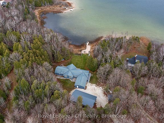 Brewsters Lake - over 200' of waterfront with a bungalow, shop and garage on a 3.2 acre hardwood lot. Lake views from nearly every room in the home. Spacious rooms throughout the 2500 square foot main level including open concept kitchen, dining and living areas with vaulted ceilings and a wood-burning fireplace. The walkout basement is fully finished with massive family room, office or 5th bedroom with ensuite; walkout to the hot tub, patio and lakeside. SHOP 30x52 with in-floor heat, spray foam insulation, Trusscore interior, 3 roll up doors; detached single garage and attached double garage with in-floor heat. On demand hot water, generator back up, metal roof, new windows (2018), central air, water system, greenhouse, hot tub and more. The private waterfront boasts a sandy beach, dock and firepit. Four season living in a four season playground 20 minutes to Collingwood and Blue Mountain, 10 minutes to Devils Glen Country Club (private) and minutes away from year-round trails and recreational activities. Includes part ownership of additional waterfront lot.