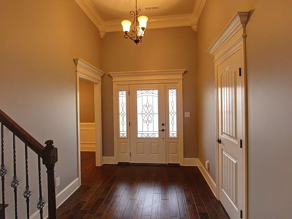 The Foresthill Plan D is a two story home with 3 car side entry garage and is backed by a 2-10 home warranty.. Home has 4 bedrooms (Master bedroom is down stairs) and 3.5 baths. Three bedrooms and a bonus room are upstairs along with 2 baths. Great Room features 12' ceiling, extensive trim, gas-log fireplace with raised stone hearth, wood plus flooring and recessed lights and ceiling fan. Dining room has 9' coffered ceiling, wood plus flooring, extensive trim including shadow box under chair rail. Kitchen includes 9' ceiling, custom cabinetry and granite counter tops, large island with raised bar seating, stainless appliances including dishwasher, gas cooktop, wall oven and wall microwave, tile backsplash, tile flooring, recessed lighting, and huge walk-in pantry. Breakfast has 9' ceiling, tile flooring and extensive trim. Laundry has custom cabinet, tile flooring. Master bedroom has 9' ceilings plus a double tray, recessed lighting, extensive trim and ceiling fan. Master bath has 11' ceilings, glamour tub with tile surround, large tile shower with tile bottom and rimless shower door, separate toilet area, double vanity with granite counter tops and huge walk-in closet. The home has hardwood stairs leading to the second story. The additional bedrooms and bonus room have ceiling fans and crown molding. Home has a large covered rear porch perfect for entertaining. Home includes fully sodded yard, gutters including piping under sidewalks and attractive landscaping. Builder has a