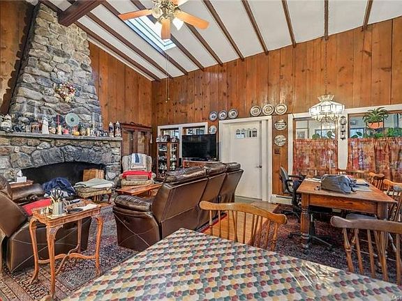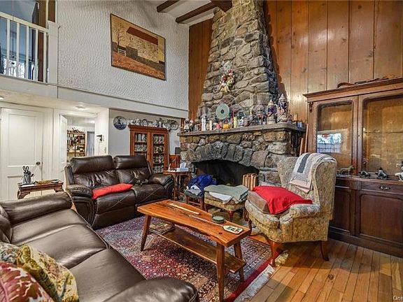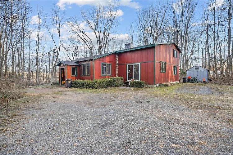 Tucked away on two wooded acres, this sweet rustic two-story home, offers plenty of privacy! Galley kitchen features some stainless appliances, tiled flooring and newer cabinetry; powder room; living dining room combination has a cathedral ceiling, gorgeous stone fireplace, knotty pine walls, hardwood floors; welcoming slate floored heated entry room sun porch; bedroom (which is being used as an office currently); second floor offers two bedrooms; full bath; more office space. Ample storage. One car garage. NYC less than 50 miles; shopping and famous Woodbury Common close. Major highways and public transportation, including rails, nearby. Perfect commuter location!