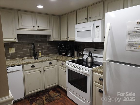 Exquisite three-bedroom, three-bath condo with a two-car garage. This unit sits among mature trees on a private cul-de-sac street, just outside the gate of Rumbling Bald on Lake Lure. Both primary bedrooms have access to private, covered decks. The Living and dining rooms can access the large, rear grilling deck facing the woods. This multi-living unit is spacious and affords the new owners a nearly turnkey unit ready for short term rentals.