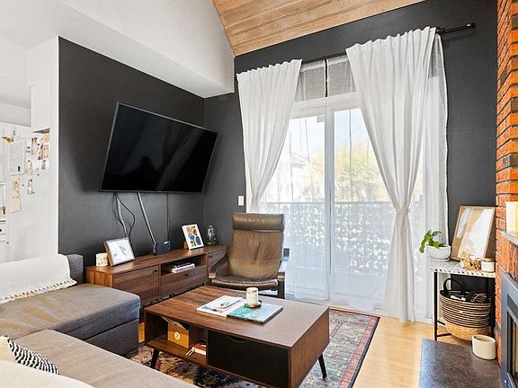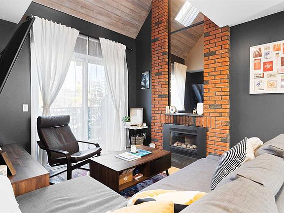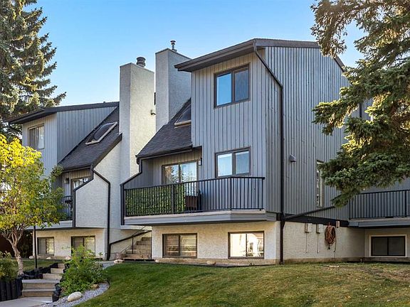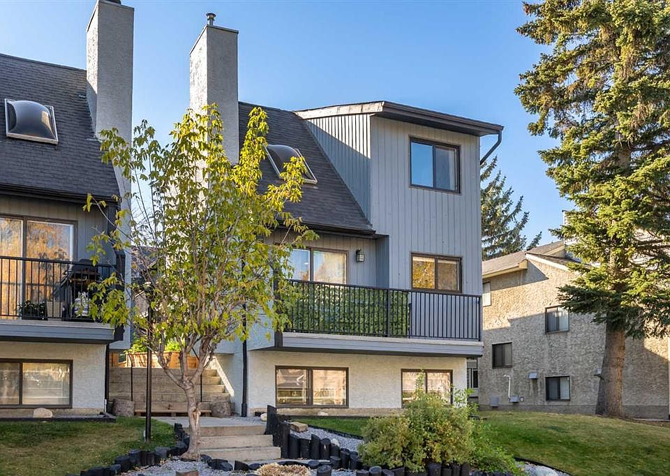 Stylish Inner-City Townhome in Crescent Heights | Vaulted Ceilings | Gas Fireplace | Live in Crescent Heights, one of Calgary’s most desirable inner-city neighbourhoods, just minutes from downtown, the Bow River pathways, and an incredible variety of cafés, restaurants, and local amenities. This architecturally distinctive multi-level townhome is a rare find, with no shared walls in the primary living spaces and no neighbours above or below. Inside, you're greeted by soaring vaulted ceilings, natural light throughout, and a warm mid-century aesthetic with exposed brick, wood detailing, and a striking feature fireplace. The inviting living room opens onto a private balcony framed by mature trees—ideal for morning coffee or an evening glass of wine. The bright white kitchen offers a Bertazzoni gas range, ample cabinetry, and sightlines through the dining area for easy entertaining. Upstairs, the lofted office, complete with skylight, overlooks the living space below, creating a perfect work-from-home environment. The spacious primary bedroom enjoys large windows, vaulted ceilings, and easy access to the updated 4-piece bath. Downstairs, a fully finished lower level offers a large bedroom, generous storage, and laundry area. Additional highlights include assigned parking, modern lighting, and a well-managed, freshly painted complex with low condo fees and a peaceful courtyard setting. As a bonus, enjoy optional use of a garden bed with south sun exposure. Experience the best of urban living with a quiet residential feel on a traffic-calmed street—just steps from Centre Street transit, Rotary Park, and schools, with quick access to downtown and major routes.