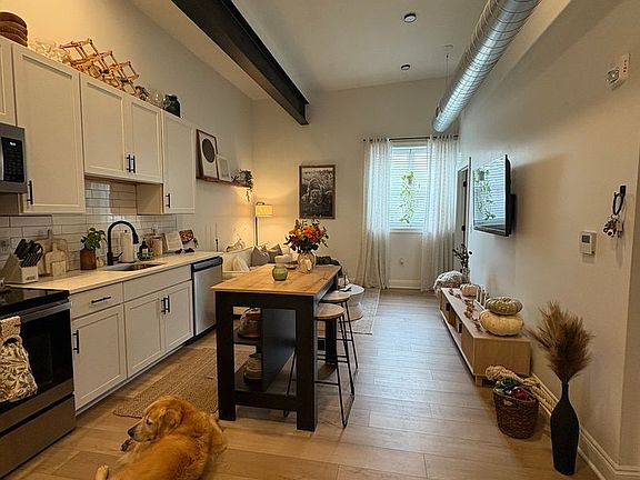 Newer luxury unit. This high-end unit is stunning with its vaulted ceilings, open layout, and amazing kitchen. Natural light floods the space over the luxury vinyl plank flooring, quartz counter tops, and stainless steel appliances. The open kitchen layout is outfitted with stainless steel appliances including a dishwasher and above-the-range microwave, quartz countertop and huge island for extra counter and dining space. There is an in-unit laundry center conveniently located in the oversized bathroom with a large quartz vanity and beautiful tiled tub shower. You'll stay nice and cool with convienet Central Air and toasty in the cooler months too! The bedroom has loads of natural light, incredibly high ceilings, closet and rustic brick accents. Location is not to be beat- within steps of the D&L trail, Riverside park, Easton Farmers Market, and all the restaurants! One year lease. Credit, Background, and Employment verification. Tenant pays all utilities. Pets considered for an extra security and monthly fee. One month security is required and first months rent due at lease signing.