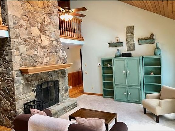 BEAUTIFUL, CHARMING HOME IN PEACEFUL COUNTRY SETTING! Great room overlooks cedar ceilings & skylighted living room w/ gorgeous oak woodwork & cozy stone fireplace. Master on main level with dbl closets &bath. Kit and Baths are updated w/ oak cabinets & swan stone counters. Covered porch in front, open deck in back overlooking fenced yard.LL bdrm could be master or in law suite. Heated 2 sty garage