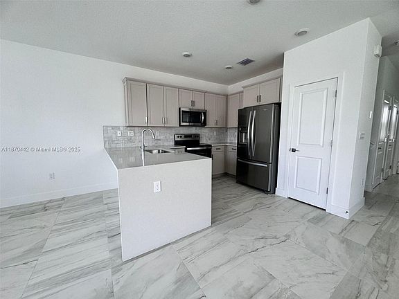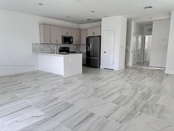Immaculate 4-bedroom / 3-bath corner townhouse in the highly sought-after Merrick Square community. This modern residence offers a thoughtfully designed floor plan with a full bedroom and bath on the first floor, perfect for guests or multigenerational living. The home showcases high-end finishes including quartz countertops, a waterfall kitchen island, subway tile backsplash, porcelain tile flooring throughout, frameless glass showers, and smart home technology. The kitchen is equipped with Whirlpool stainless steel appliances, and a washer & dryer are included for convenience. Move-in ready schedule your private showing today!