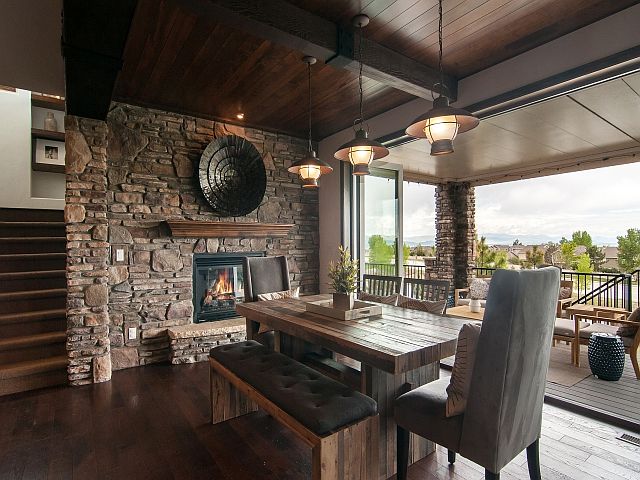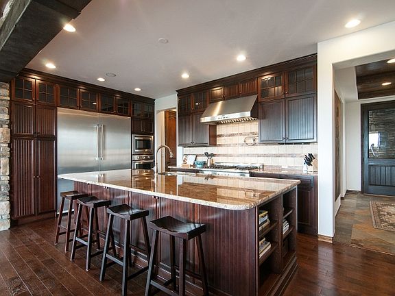 Spectacular Former Model Home w/Big Mountain City Views. Loaded with Custom Upgrades Including Rock Walls, Beamed Planked Ceilings Dual Bi-Fold Doors Which Allow You To Seamlessly Combine Indoor Outdoor Living Spaces. Gourmet Kitchen w/Large Island Thermador Appliances Features two 36" Refrigerators, 2 Dishwashers, a 6 Burner Stove w/Griddle Pot Filler. Adjacent Hearth Room with Cozy Fireplace Opens to Large Covered Deck. Hardwood Slate Tile Flooring thru-out Entry Main Living Spaces. Office/Parlor Near Front Entry Includes Fireplace. Dining Space Looks Towards Wine Room Which is Beautifully Displayed Through Iron Doors. Master Bedroom Suite with Private Deck. Two Secondary Beds Baths + Large Loft (can be converted to a bdrm) Laundry upstairs. Exceptionally Finished Basement Added in 2014 Uses Same High Level Finishes as Upper Levels has Large Entertaining/Bar Area w/2 Fireplaces, an Additional Bed Bath. Professionally Landscaped Lot w/WaterFeature. Gorgeous!