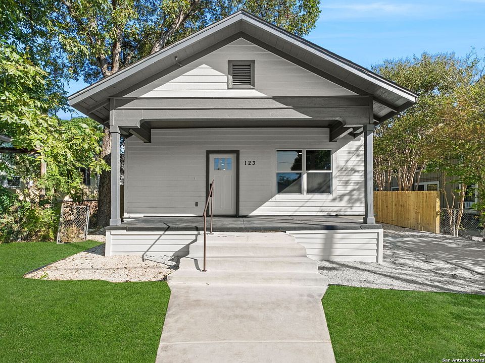 Step into the charm of San Antonio living in this beautifully updated historic one-story home that perfectly balances timeless character with modern comfort. With 3 bedrooms, 2 full baths, and 1,488 sq. ft. of thoughtfully designed space, this home welcomes you with a warm, open layout ideal for both everyday living and entertaining. Inside, you'll find recessed lighting, modern fixtures, and a seamless flow between the living, dining, and kitchen areas. The kitchen shines with a stylish backsplash, bright cabinetry, a walk-in pantry, and newer appliances. The primary suite offers a tranquil retreat with a generous walk-in closet and private ensuite bath. Enjoy outdoor living from the large covered front patio, the perfect spot for morning coffee or evening conversation, and a backyard with a new privacy fence offering plenty of space to garden, entertain, or let pets play. The off-street parking pad also provides everyday convenience. With updates including a newer water heater, modern finishes, and central AC, this home combines classic appeal with contemporary comfort. Conveniently located just off I-35, you're minutes from The Pearl, Downtown San Antonio, and Fort Sam Houston, with quick access to local dining, shops, and entertainment. Whether you're drawn by the history, the location, or the lifestyle, this property is the perfect place to call home in the heart of San Antonio.