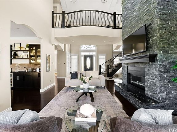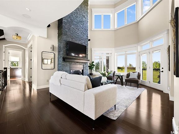 Step into unmatched luxury with this one-of-a-kind custom property, offering over 4,075 sq. ft. on the main and second levels plus a fully developed 2,500 sq. ft. walkout. Situated on 4.89 landscaped acres, this home blends elegance, comfort, and technology. A grand foyer with heated granite tile and a sweeping spiral staircase set the tone for the home’s sophistication. The living room features expansive windows and a cozy gas fireplace, opening to the dining area with bar fridge and custom cabinetry. The chef’s kitchen boasts Sub-Zero refrigeration, Jenn-Air appliances, walk-in pantry with heated tile, Culligan water filtration, and direct access to a three-season sunroom. The primary suite is a private retreat with cork flooring, his & hers walk-ins, spa-inspired ensuite with heated tile, Bain Ultra soaker tub, dual vanities, and a built-in mirror TV. Upstairs are 3 bedrooms and 3 baths, including 2 ensuites and a shared bath with tub/shower, plus a large bonus room. The walkout lower level includes a theatre with projector/screen, wet bar with wine room, exercise studio, sewing/office space, and an additional bedroom with ensuite. In-floor heat runs throughout, and 4 rooms offer direct backyard access. Smart home features include Savant automation for TVs, fireplaces, and blinds, Apple TV, Xbox/DVD integration, and 3 Shaw Direct satellite dishes. Bedrooms have blackout + lace blinds, while automated blinds are in the kitchen, living, and theatre. Additional highlights include heated mudroom tile, central vac with extra hoses, security with 8 cameras, fire sprinklers, and a heated 5-car garage with wheelchair-ready access. Outdoors, enjoy a multi-purpose sport court, solar-lit driveway, upper & lower decks with built-in BBQs, underground sprinklers, and wiring for a future hot tub. This property offers acreage living at its finest — a perfect blend of luxury, technology, and comfort in a private setting. Ask your REALTOR® for a full list of features!
