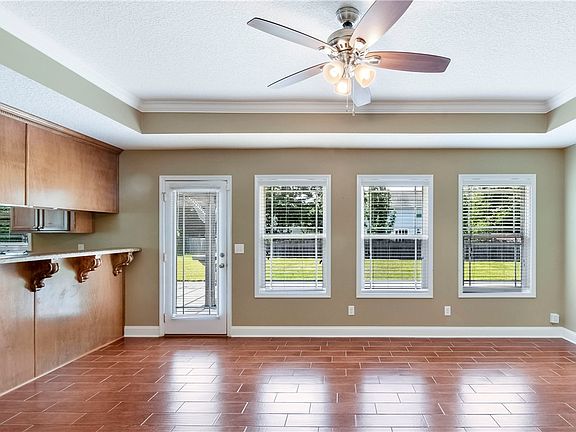 Large patioSplit floor planWall of windowsAbundance of natural lightStainless steel appliancesModern kitchenView of the backyard