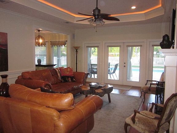 Welcome Home to this beautiful 4 bedroom 3 full bath home on the LAKE and INGROUND Pool. This home features open greatroom and dining with lit trayed ceilings with built-in custom cabinetry surrounds the fireplace with surround sound system. Designer lighting by Noir with crown molding and wainscoting is featured in main living areas and master bedroom. Kitchen has a massive island, exquisite granite countertops, chocolate glazed finished cabinetry with 2 built-in wine racks, tumblestone backsplash, center island makes any cook happy to be in the kitchen. Oversize master bath with whirlpool tub and water closet. There is a guest suite, custom closets in every bedroom. The stone FIRE PIT area with OUTDOOR LIGHTING completes this beautiful home You can call Yours!!! Owner licensed agent.