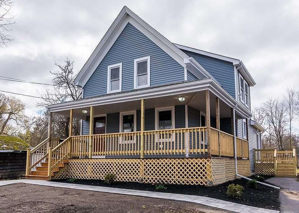 Beautifully renovated New England Colonial is new from top to bottom. Featuring a stylish eat-in kitchen with two toned cabinetry with oversized island, top notch appliances including vented hood fan, refrigerator, in-island microwave, and more. Huge 31' family room provides plenty of space to enjoy. A first floor office is perfect for an in home business. Set in the Downtown business district, invite a client off the front farmer's porch, it is likely zoned for your needs, or open a book and enjoy your den. Three bedrooms, 2 baths upstairs including a master suite with walk in closet and glass door shower en suite. New roof, windows, siding, electrical, plumbing, and super energy efficient with fully filled walls, roof and basement coating for insulation with high efficiency natural gas heating system and central air. Nine foot ceilings abound and the entire home has hardwood floor and tiled baths.Take a look at the quality and attention to detail and you will love this home