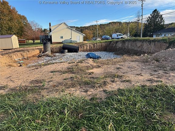 The property has a basement dug to grade, rip rap base is laid down, the lumber for the footer forms are on site, there's a 12x16 out building that's one year old, electric for construction is on site, sewer tap and line is laid up to the basement excavation, the water line with a meter is onsite, property drainage to keep the neighbors happy it's in place, rebar is onsite that will fit a forty by sixty foot rectangular footer, and there's a ninety percent complete retaining wall onsite. The variance for the elm drive property line has been approved already. The yellow flags onsite are the gas company setback and are pretty much running down the property line. Anyone looking at the property that would like to speak with me can easily be arranged.