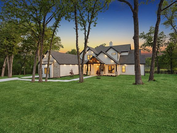 This transitional-style masterpiece blends modern elegance with timeless design. Step through the door and be greeted by soaring ceilings, natural light, and amazing lake views from your south-facing backyard. This property also has mature specimen Post Oak trees and a unique blend of views.