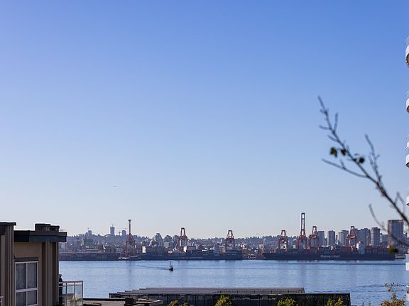 I LOVE THIS BUILDING!! Boutique style by Fairborne. Gorgeous 2 bedroom 2 ensuite & den with spacious open floor plan overlooking an intimate water view. Corner unit gives you lots of window and light.This is what you have been waiting for. All New custom colour Benjamin Moore paint throughout, New carpet in bedrooms, New gas stove, New microwave. Beautiful bathrooms with Duravit plumbing. Gorgeous chef's kitchen- loads of cupboards in a two tone Eucalyptus & stainless appliances. Radiant heat for ultimate comfort. Unique roof top deck media room/lounge with fireplace opens out to huge BBQ deck & gardens & VIEW. Fabulous Lower Lonsdale location-Bookstore,Restaurants, Cafe's,Community Centre & Ernest Ice Cream street level & walking distance to Lonsdale Quay, Polygon Gallery & more.