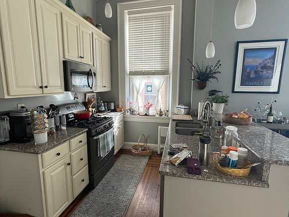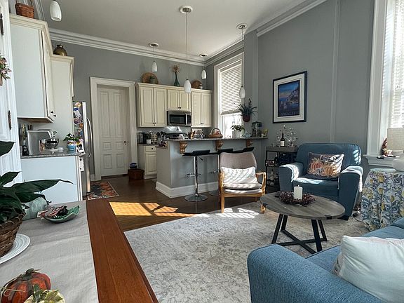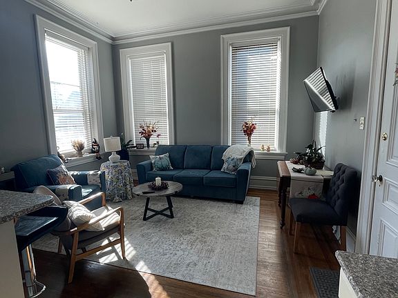 This gorgeous 1st floor apartment with elegant finishes is a 19th century Victorian building in the heart of historic Boyertown, PA. Enjoy the bright, sunny living room and kitchen, boasting 11 foot ceilings, original inlaid hardwood floors and original crown molding. The kitchen has granite counters, stainless steel appliances and creamy white cabinetry. The open concept kitchen and living room keep this apartment light and airy.