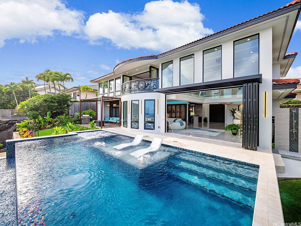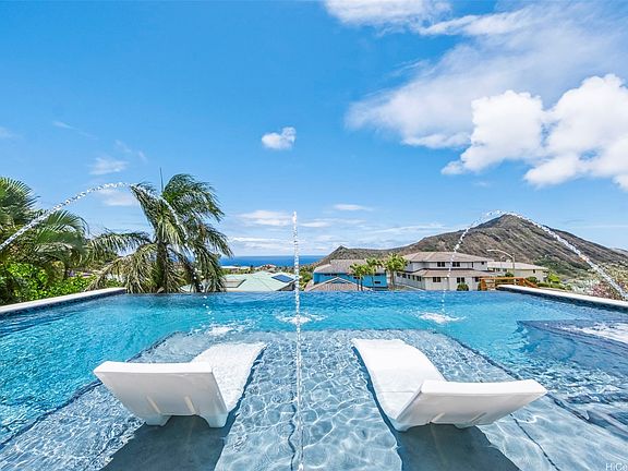 NEW CONSTRUCTION. Luxury living in this stunning 5-bedroom, 5.5-bath custom-built estate in Na Pali Haweo. Constructed with steel frames, beams, and columns, this home offers breathtaking panoramic views of the ocean, Koko Crater, and vibrant sunsets. The expansive open floor plan showcases soaring ceilings and designer Thermador appliances, including a magnificent Calacatta Italian marble island. LED lights are embedded in the walls and in the custom European kitchen cabinets that have drawers with soft touches. Ininity smart, self-cleaning saltwater pool and spa feature a sophisticated glass finish. Each bedroom has ensuite bath, primary has golden bathtub, and one room is flooded with natural light from seamless corner windows. Enjoy stylish porcelain floors from Spain and sky-high crystal chandeliers. Throughout, white and gold slab quartz, marble, and elegant wainscoting enhance the luxurious ambiance, including golden vanity sinks and a gold bathtub in primary bath. 123 Waihili embodies modern island living, where you can experience tranquility and relaxation with this indoor-outdoor lifestyle that features a serene zen retreat. More than one photo was enhanced. Ask 3-D Tour.