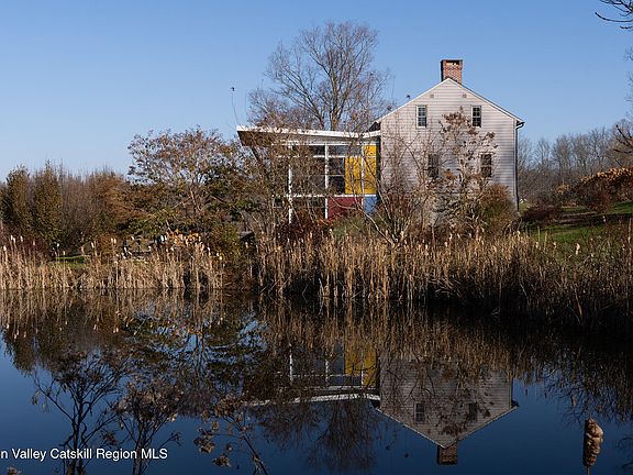 In a mix of classic upstate and artist-designed modern architecture, this 20-acre Columbia County parcel offers the best of both worlds. Located on a quiet road just a short distance from Hudson, Art Omi, and Bartlett House, this house feels both private and conveniently accessible. Two separate barns to use as office, studio space, or storage. Large glass windows make up half of the house. The land surrounding the house features open fields, active meadows, a pond, and wooded areas perfect for exploration. This home is three stories with the ability to have two bedrooms on the entry level. The main bedroom has a working fireplace, a spacious closet, and an adjacent bathroom. The third floor has a bedroom, studio space, and its own bathroom. The main magic happens in the glass kitchen and dining space, with Western light coming in during golden hour. The third bedroom is best suited as a guest bedroom, office space, or spare room. The kitchen leads out to the back gravel deck for easy outdoor meals and hosting. Original wide board flooring in the top two floors of the original house. Second fireplace and built-in pizza oven in the downstairs living room. In a mix of classic upstate and artist-designed modern architecture, this 20-acre Columbia County parcel offers the best of both worlds. Located on a quiet road just a short distance from Hudson, Art Omi, and Bartlett House, this house feels both private and conveniently accessible. Two separate barns to use as office, studio space, or storage. Large glass windows make up half of the house. The land surrounding the house features open fields, active meadows, a pond, and wooded areas perfect for exploration. This home is three stories with the ability to have two bedrooms on the entry level. The main bedroom has a working fireplace, a spacious closet, and an adjacent bathroom. The third floor has a bedroom, studio space, and its own bathroom. The main magic happens in the glass kitchen and dining space, with Western light coming in during golden hour. The third bedroom is best suited as a child's room, guest bedroom, office space, or spare room. The kitchen leads out to the back gravel deck for easy outdoor meals and hosting. Original wide board flooring in the top two floors of the original house. Second fireplace and built-in pizza oven in the downstairs living room.