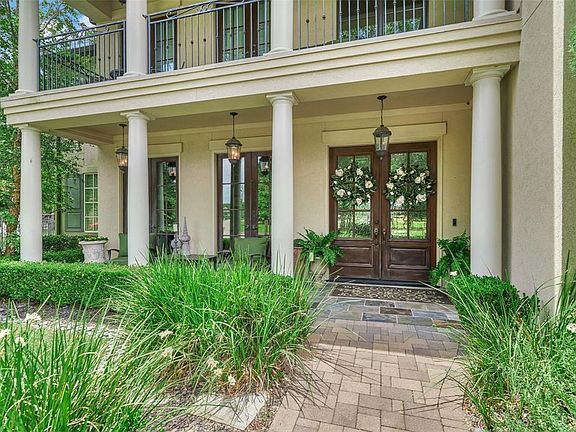 Exquisite French-inspired Jeff Paul Custom Home on large private, pie-shaped lot in the exclusive gated enclave of Elk Trace in Woodforest! This home exudes refined elegance from the moment you walk up to the front porch w/gas lanterns & double door entry. 2 story living room open to kitchen w/views of pool. Formal Dining has groin ceiling w/hand painted details & bricked wine grotto. Downstairs media room can be used as a 2nd study or 3rd bedroom down. Pool Bath has walk in shower. Master privately located, beautiful spa like bath w/sparkling chandelier & huge walk in closet. Upstairs Game Room & bonus room that can be 2nd media, guest room. True side-by-side 3 car garage. HUGE Backyard has expansive outdoor living spaces w/summer kitchen, grill, fireplace, firepit, putting green, trees that create private oasis!