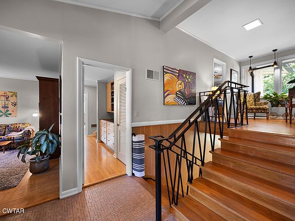Truly a RARE architectural gem! This Mid-Century Modern in-town home is truly unique. From the moment of entry there is a visual feast. Large formal living and dining rooms provide a flood of natural light. The updated kitchen is well-appointed and has an island as well as a breakfast area. A hallway with built-in storage leads to the primary bedroom with its dressing area, vanity, a huge walk-in closet and full bath. A few steps up lead to two bedrooms, each with its own bath. The family room with fireplace overlooks the dining room and a unique "flex space" could be a reading nook. The laundry room is large and has extra counter space as well as cabinets. Downstairs is an ideal sperate living space with an enormous rec room, "double bedroom" and a full bath. A separate entry/exit make it ideal for extended stay guests or family. Truly "One-of-a-kind"!