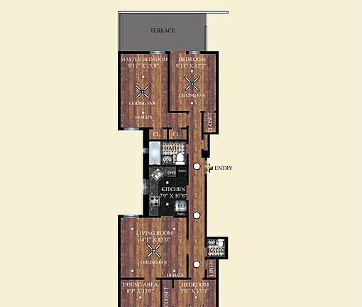 We provide outstanding amenities in our four bedroom/1.5 bath apartment homes, each with its own large terrace. Call today to find out about our luxurious renovations*. Tour our newly updated interiors with Tuscany-style kitchen cabinetry with undermount lighting, sleek granite countertops, stunning granite kitchen flooring and GE Cafe Series Stainless Steel Appliances and in-unit stackable washer/dryer! You will come home and enjoy the comforts of air-conditioning, hard wood flooring, thick crown and base molding, beautiful two-tone paint, 2-inch faux woodgrain window treatments, high-hat lighting. Relax in our new vintage-look granite and marble bath with frameless doors, rain showerhead.