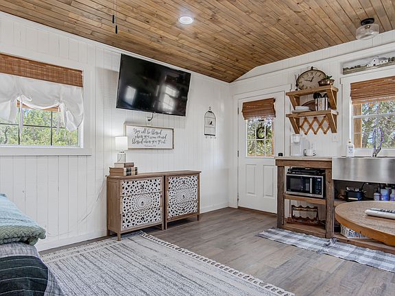 Inside, the Shooting Star Cabin features warm wood finishes and abundant natural light in a studio layout. The space includes a comfortable queen bed (with an optional rollaway for a third guest), a dining nook, and a kitchenette equipped with a refrigerator, combination microwave/oven, Keurig coffee maker, and basic utensils. Modern touches like a Roku-ready smart TV, WiFi, and efficient heating and cooling provide convenience, while the full bath with shower and fresh linens ensure comfort.