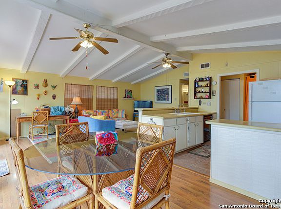 Cheerful bungalow made for your lake house retreat. Main house has 2 bedrooms, 2 baths along with a recently upgraded guest house with its own full bath. Guest house also has a little kitchen sink with a coffee bar. Main house has large open living area opening out to large deck partially covered. Seller has added plants and birdbaths inviting a beautiful aviary. A family of cardinals visit daily. Xeriscaping with colorful plants. Main house needs some upgrading, good bones and being sold as is. Main house in need of new flooring. Guest house remodel is recent with a new shingle roof because of hail damage. Main house has a metal roof. HVAC replaced in 2016. The HOA dues is $24 a year with lots to do: pool, club house, tennis courts, sports court, park with BBQ pits, tables, swings, access to Guadalupe River that flows into the Canyon Lake, Public Boat Ramp #11 is in the subdivision with no fee.