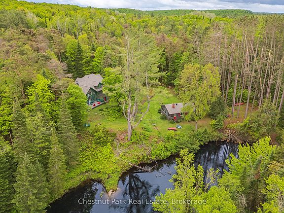 Where Stories Begin and Memories Stay: A Family Riverfront Retreat on the Black River Own it solo or share it with family or friends the magic of Muskoka is best when experienced together.Nestled along 405 feet of private shoreline with breathtaking westerly sunsets, just outside Bracebridge, this exceptional property offers not one, but two distinct dwellings, making it the perfect setting for multi-generational living, shared ownership, or a timeless family getaway.The main year-round residence, built in 2005, welcomes you with a warm timber framed accents design and soaring windows that flood the space with natural light and frame the beauty of the river beyond. Its open-concept layout is both bright and inviting, with a main floor primary suite, three additional bedrooms upstairs, and two dens below. A stunning stone fireplace anchors the living space, while a Muskoka room extends your living area into the trees perfect for relaxing to the sounds of the forest or gathering for evening games and laughter. The lower level also features a large games room, a formal living room, and walkout access that keeps you effortlessly connected to the outdoors. Steps away, the 1974 log cabin stands as a testament to decades of family joy. Lovingly preserved, it offers three generous bedrooms, a 3-piece bath, its own Muskoka room, and a storybook setting right at the rivers edge. Here, children catch frogs by day and roast marshmallows by the campfire under the stars by night. The walls echo with laughter, and the beams hold generations of memories. With no other structures in sight, this is your own hidden paradise where peace, privacy, and natural beauty converge. Whether you're seeking a peaceful year-round home, a multi-generational compound, or an investment in connection and nature, this property delivers the lifestyle only Muskoka can provide. Don't miss your chance to make Muskoka HOME!